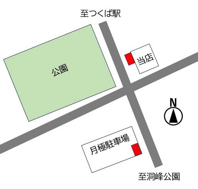 当店の駐車場は月極駐車場1番とお店の前の駐車場(縦列駐車)の2台分となっております。(地図の赤い部分です)