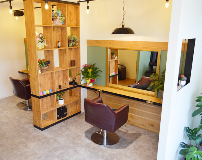 やわらかい光が差し込むナチュラルな店内。2席のセット面は広々として、お子様連れでも安心のくつろぎ空間。人の目を気にすることなく自分だけのプライベートかつアットホームな空間で、気持ちもスッキリ、心行くまでオシャレをお楽しみください。